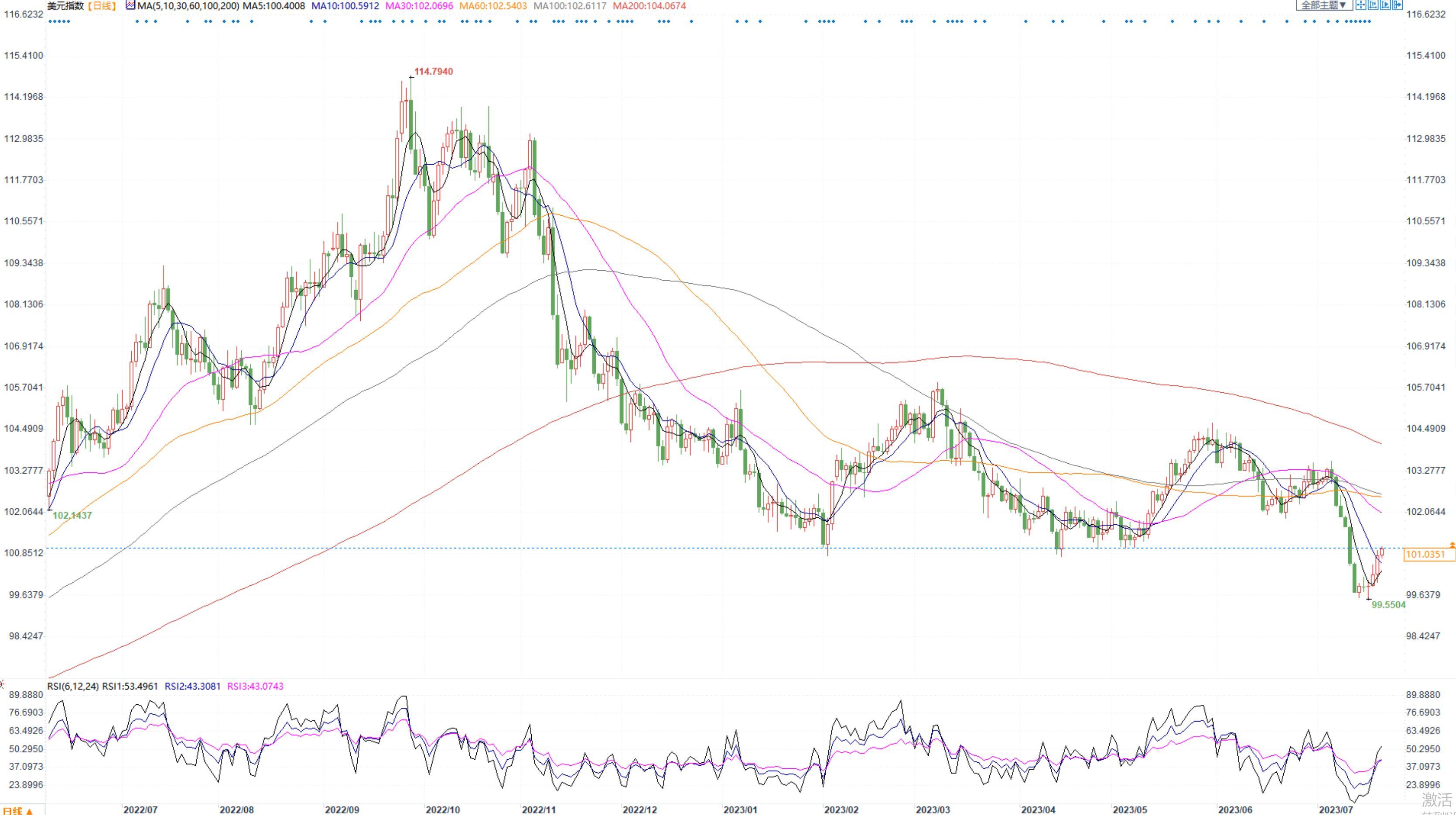 美元指数本周有望上涨1%,录得一个月来首次周线涨幅。分析师预计美联储下周货币政策会议将升息25个基点。投资者关注美联储主席鲍威尔会后发言,以寻找9月是否会再次加息的新线索。