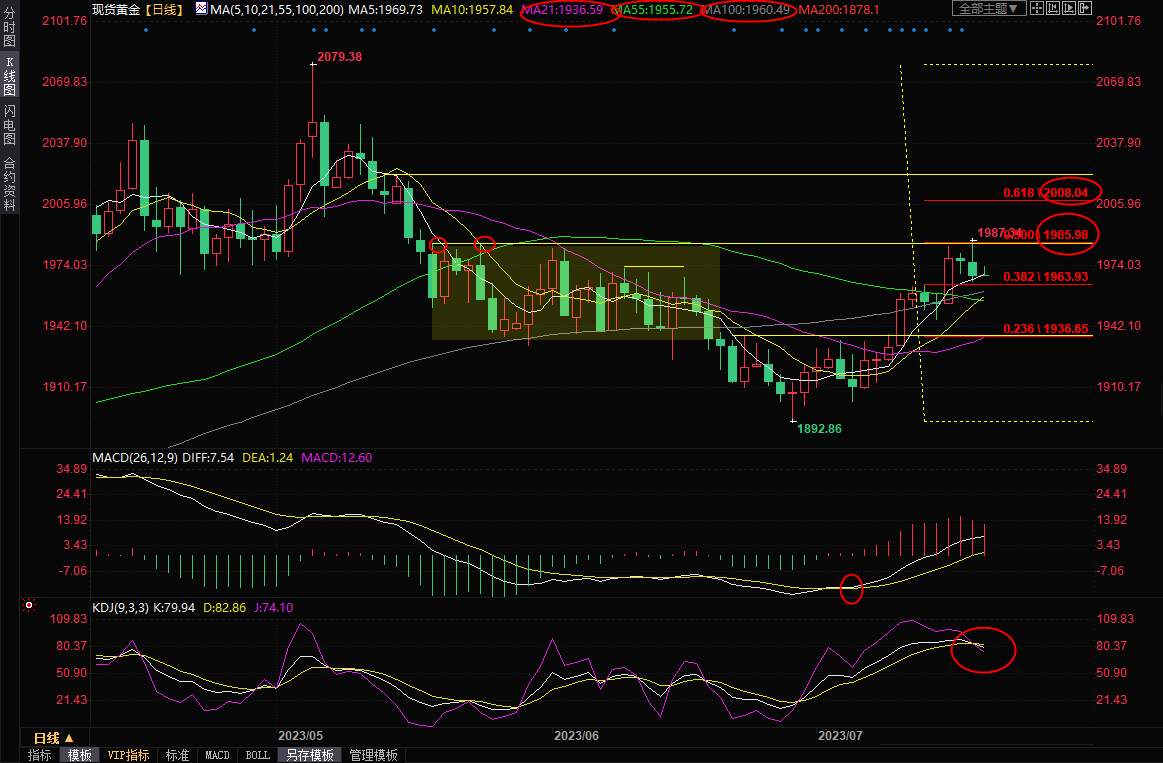 日线级别:震荡上涨;金价周四遭遇逾两个月高点和2079-1892跌势的50%回撤位的双重阻力位压制后回落,在十字星后录得带上影线的阴线,暗示上方卖压较强,KDJ初步形成死叉,短线见顶信号有所增强,下方初步支撑在100日均线1960.49附近,如果失守该支撑,则增加短线看空信号;进一步支撑参考55日均线1955.72附近位置,周一低点支撑在1945.67附近,强支撑在21日均线1936.57附近,6月23日高点支撑也在该位置附近,若进一步失守该支撑,则增加中线看空信号。