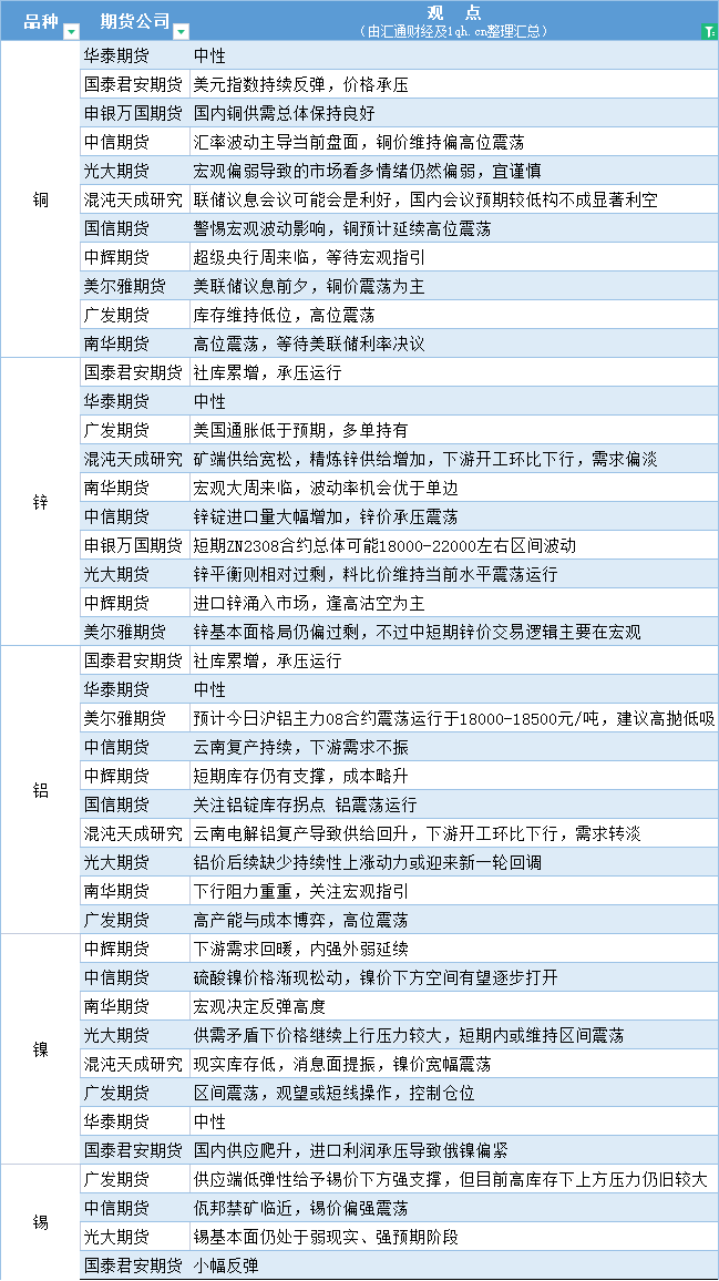 标题:期货公司观点汇总一张图:7月24日有色系(铜、锌、铝、镍、锡等)