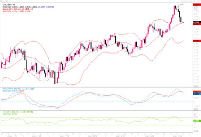 英镑兑美元近期下跌了2%。但是考虑到英国远高于美国的通胀率要回归正常化所需的时间因该比美国更长,起码也会使英镑的高利率保持较长时间。因此,利差因素终将还会给予英镑支撑。日线图上,英镑/美元跌至布林带通道中轨线,技术指标MACD形成死叉,短线显示仍存在下跌风险。当前关键支撑在1.2800,若跌穿,下跌风险进一步加大。相反若守住的话,反弹可期。