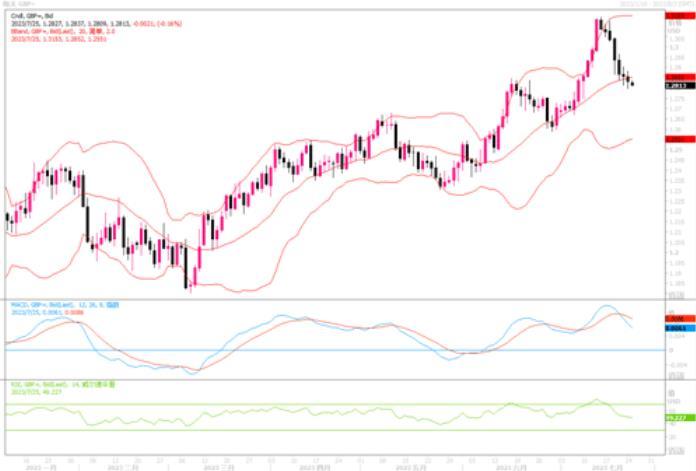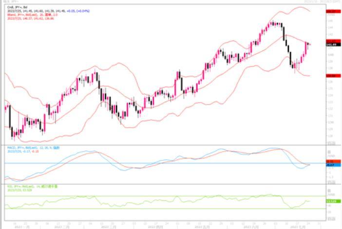 美元兑日元下跌0.22%,收盘于141.48。本周日本央行也将召开利率会议。尽管日本央行的官员们似乎仍保持着维持宽松的态度。但交易员们似乎觉得在这三大央行中,日本央行最有可能宣布引发市场波动的意外决定,交易员称,市场认为日本央行将有可能调整其收益率曲线控制(YCC)政策。如果日本央行最终果然有所行动的话,无疑将会引起日元的剧烈波动。因此,汇市上日元的交易似乎有提前为此做准备的动向。日线图上,美元/日元此轮反弹目前遇阻于布林带通道中轨线。4小时图上,MACD信号线出现粘连,RSI也从超买区域有所回落,美元继续冲高力度开始减弱。在欧美日三大央行会议出炉结果之前,料美元/日元的交投将变得谨慎。