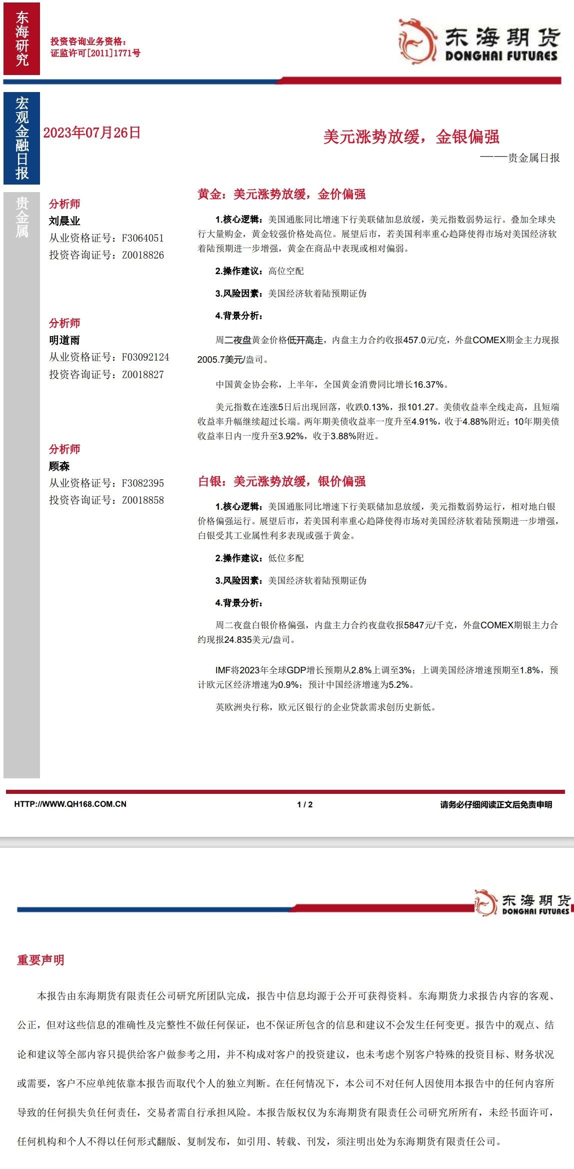标题:【东海期货7月26日产业链日报】贵金属篇:美元涨势放缓,金银偏强