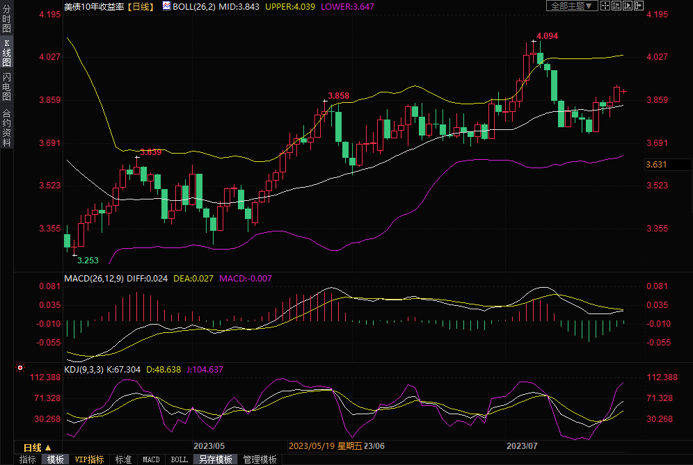 10年期国债收益率周二盘中最高触及3.922%,为7月12日以来新高,收盘上涨1.5%,收报3.915%。周三亚市小幅回落,截止10:00,目前交投于3.897%附近。
