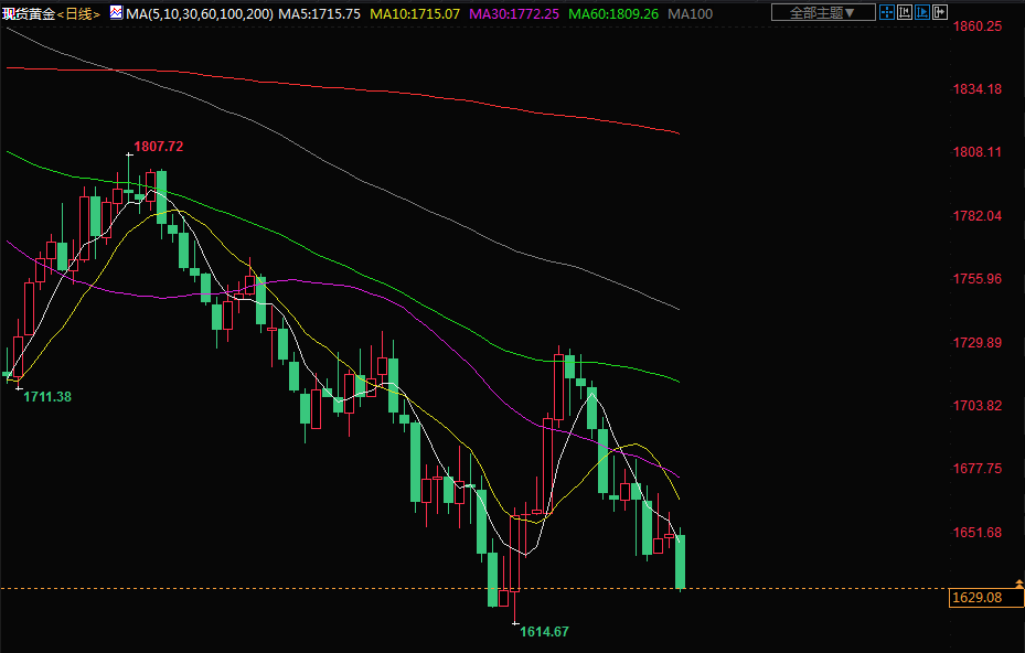 金价周三下跌超过1%,至三周低点,因为美元和美债收益率上升,美联储激进加息的前景进一步打压金市。现货金下跌1.5%至每盎司1627.81美元,此前在盘中早些时候触及9月28日以来的最低点。