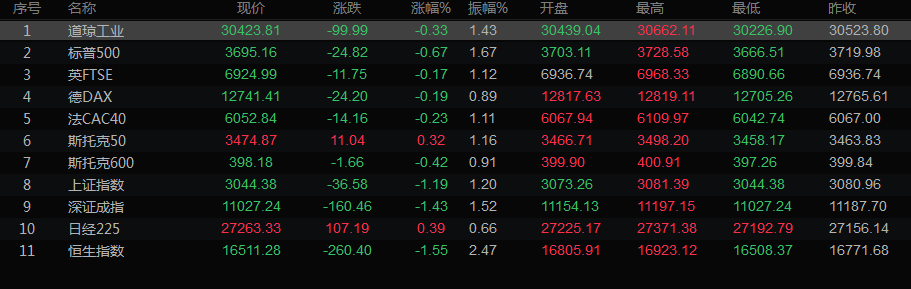 美股收盘情况: 道琼斯工业指数下跌0.33%,至30423.81点;