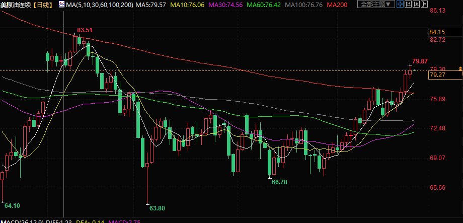 美原油交投于79.35美元/桶附近;油价周二延续涨势,触及三个月新高至79.87美元/桶,有迹象表明供应趋紧,且世界第二大经济体承诺支撑经济,这提振了市场情绪。