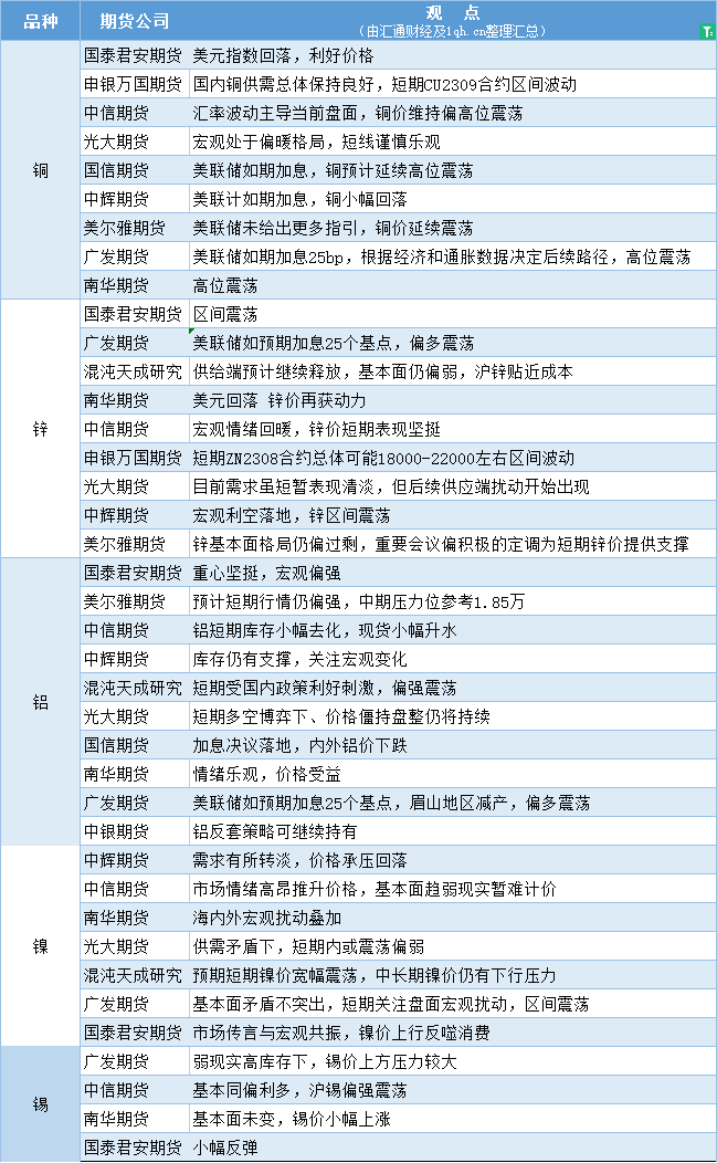 标题:期货公司观点汇总一张图:7月27日有色系(铜、锌、铝、镍、锡等)