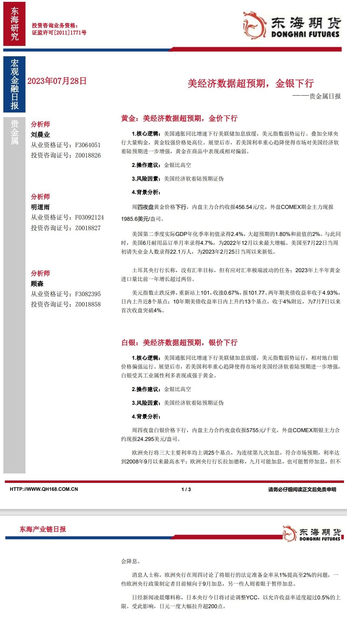 标题:【东海期货7月28日产业链日报】贵金属篇:美经济数据超预期,金银下行
