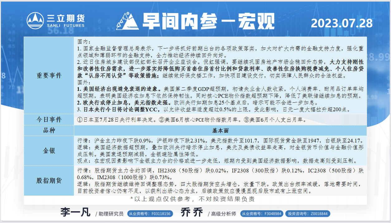 三立期货早间内参显示,在宏观因素影响下,金银主力合约价格或进一步走低。