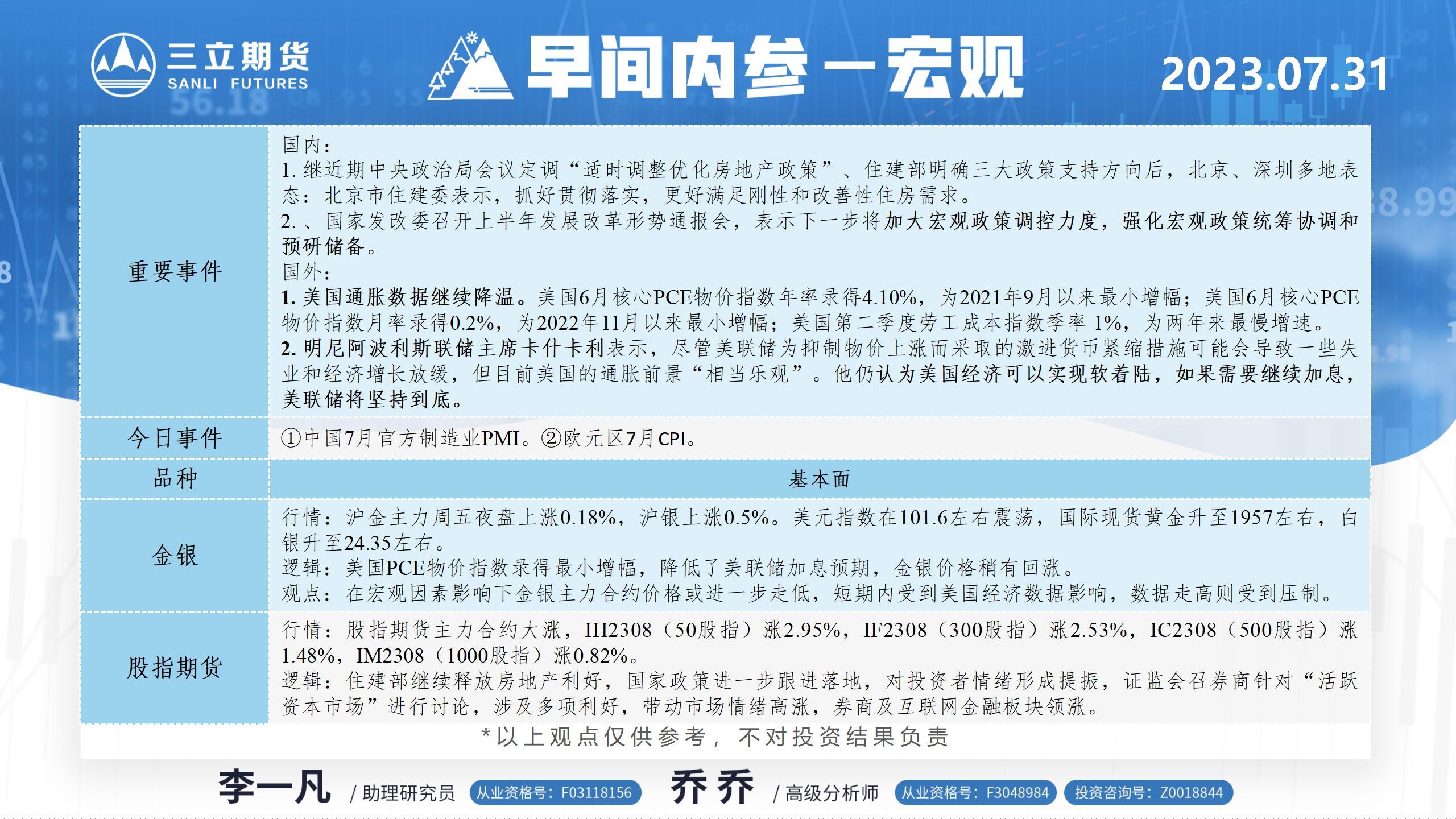 三立期货早间内参显示,美国PCE物价指数录得最小增幅,降低了美联储加息预期,金银价格稍有回涨。在宏观因素影响下金银主力合约价格或进一步走低,短期内受到美国经济数据影响,数据走高则受到压制。