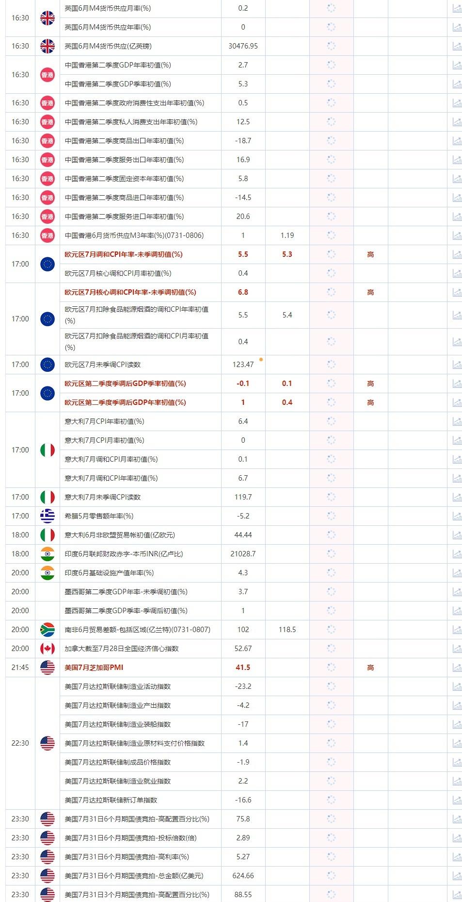 17:00 欧元区7月调和CPI年率-未季调初值(%) , 前值 5.5 , 预期值 5.3 , 公布值:待发布17:00 欧元区7月核心调和CPI月率初值(%) , 前值 0.4 , 预期值 -- , 公布值:待发布