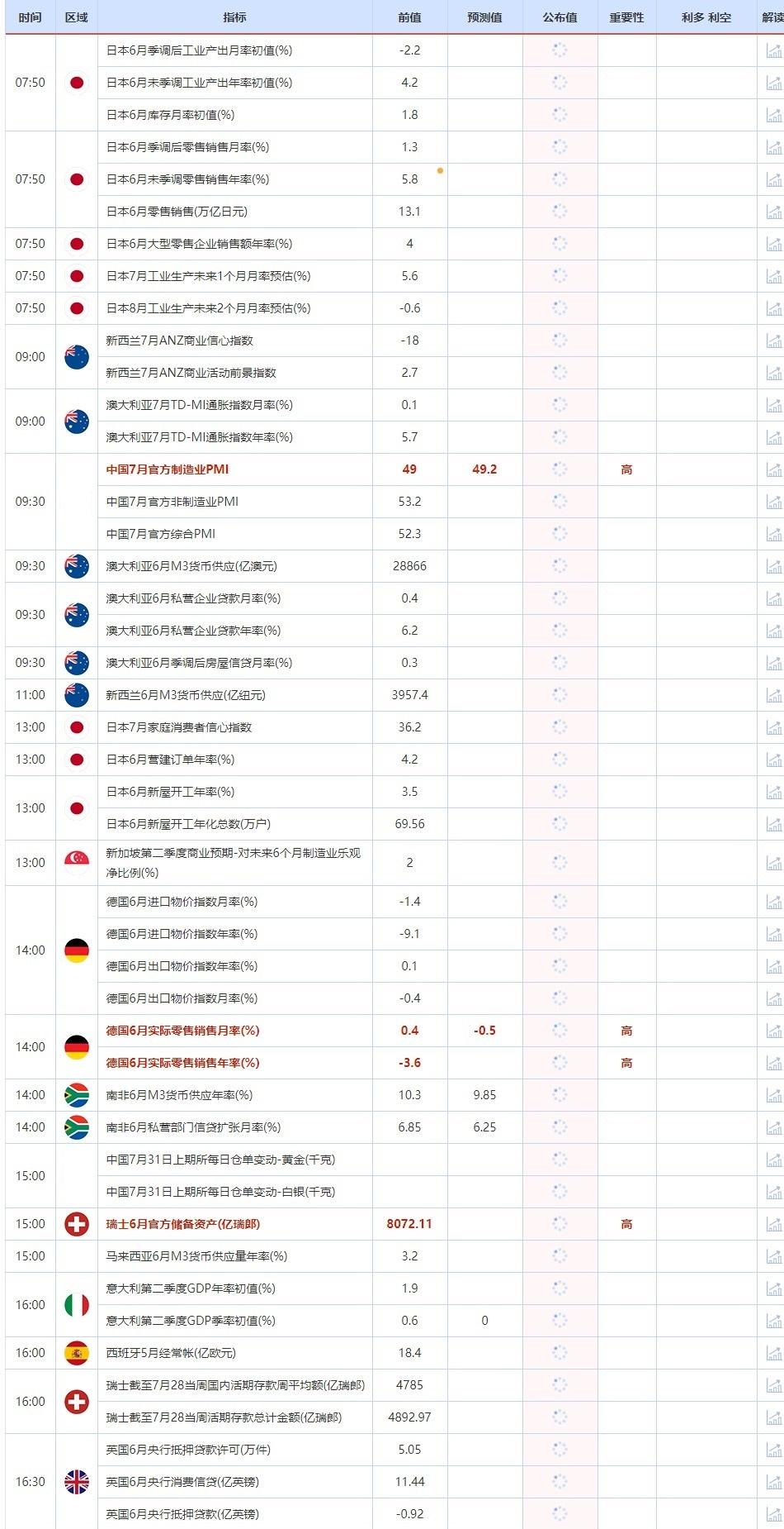 09:30 中国7月官方制造业PMI , 前值 49 , 预期值 49.2 , 公布值:待发布09:30 中国7月官方非制造业PMI , 前值 53.2 , 预期值 -- , 公布值:待发布