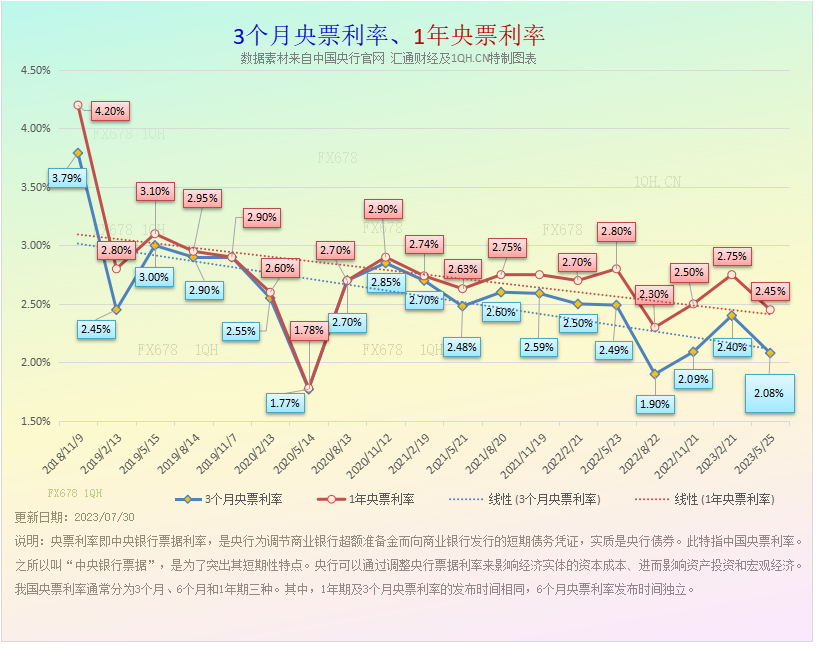 下图7:中国3个月+1年期“央票利率”的历史数据一览: