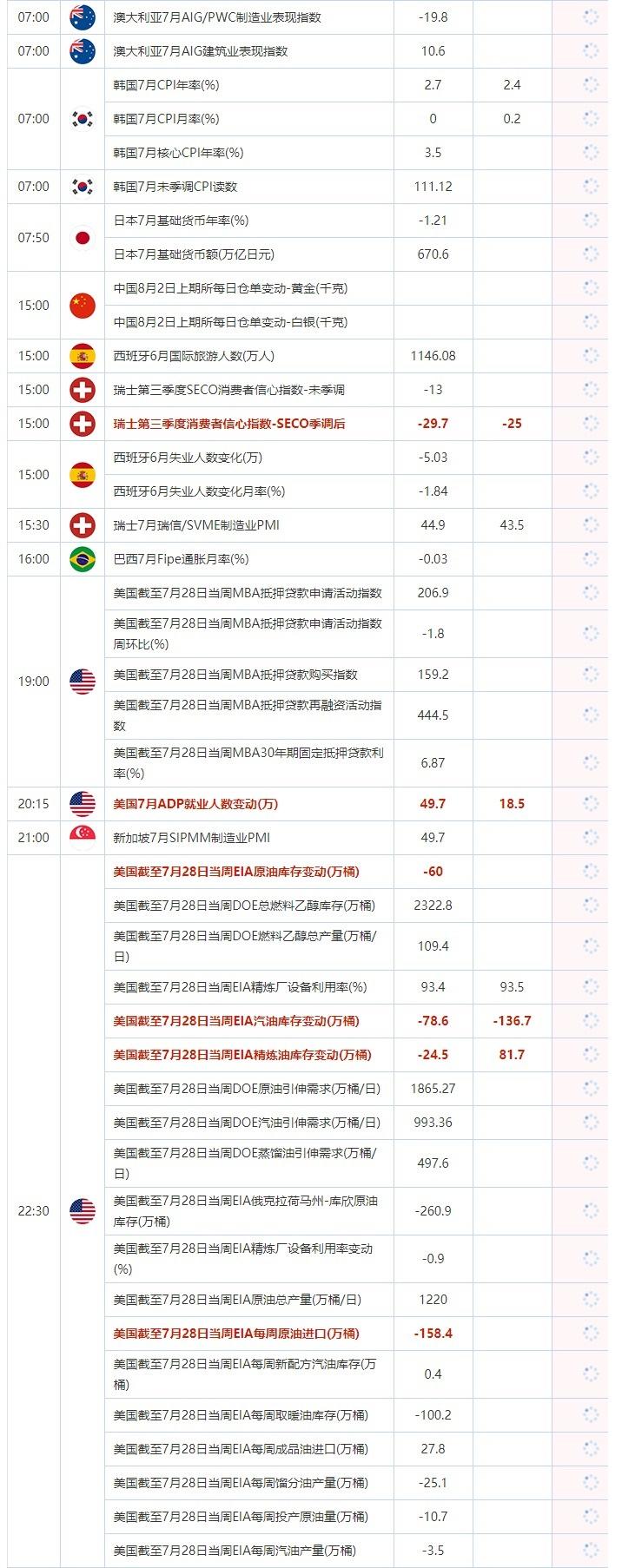 20:15 美国7月ADP就业人数变动(万) , 前值 49.7 , 预期值 18.5 , 公布值:待发布21:00 新加坡7月SIPMM制造业PMI , 前值 49.7 , 预期值 -- , 公布值:待发布