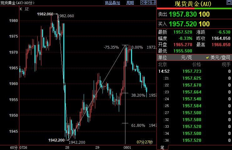 现货黄金下跌0.52%至1955.12美元/盎司;COMEX期金主力合约下跌0.80%至1993.1美元/盎司;