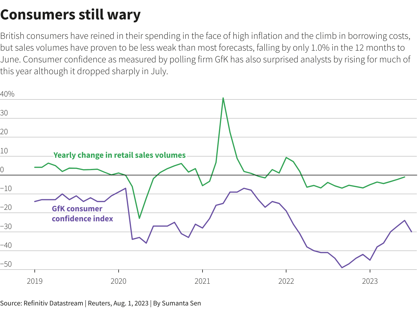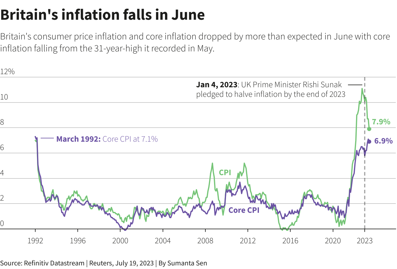 1.通胀威胁英国6月份消费者物价通胀率降幅超过预期,从5月份的8.7%大幅降至7.9%。但仍然是七国集团(G7)经济体中最高的。
