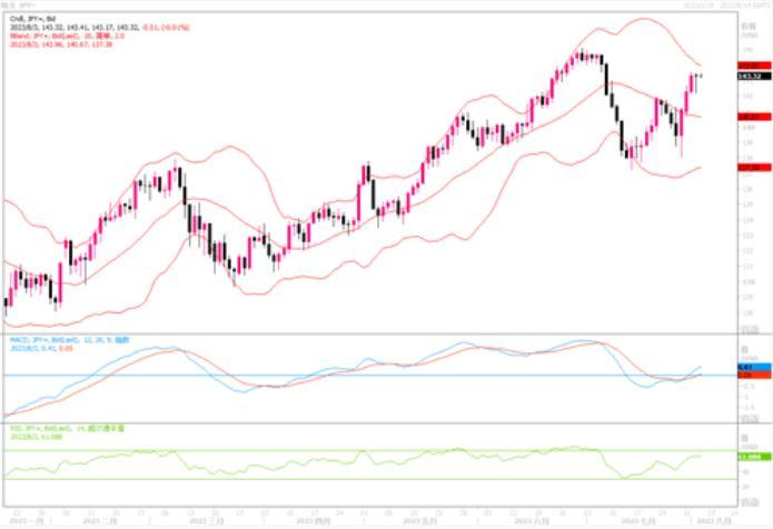 美元兑日元有效穿越布林带中轨并向上轨渐渐逼近,技术指标开始穿越均衡线向上延展,显示美元多头力道在加强。不过近期的美元/日元上升斜率过大,短线需注意出现震荡调整的风险。短线调整性的回落只要企立在141之上,恐怕后市走向还是有望冲击年内高位145附近的水平。