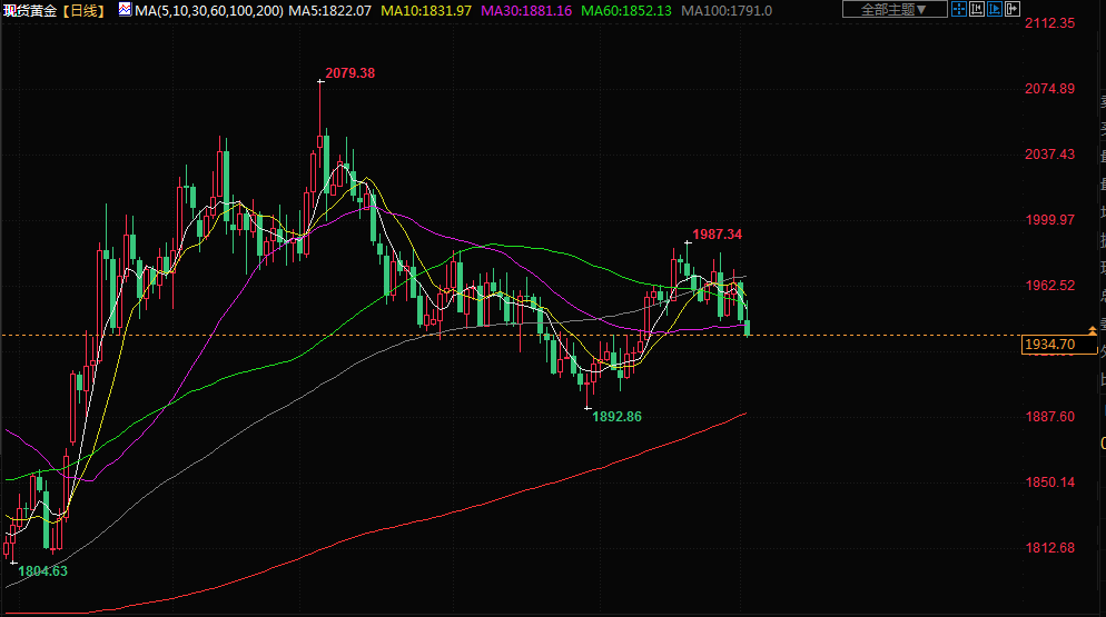 金价周三下滑,因数据显示美国7月民间就业岗位增幅超预期,美元上涨,债券收益率走强。RJO Futures 的高级市场策略师 Daniel Pavilonis 说,“利率上升最终会给黄金带来压力。此外,我们还看到美元更加坚挺,金价暂时被困在2000美元以下和1900美元以上。”
