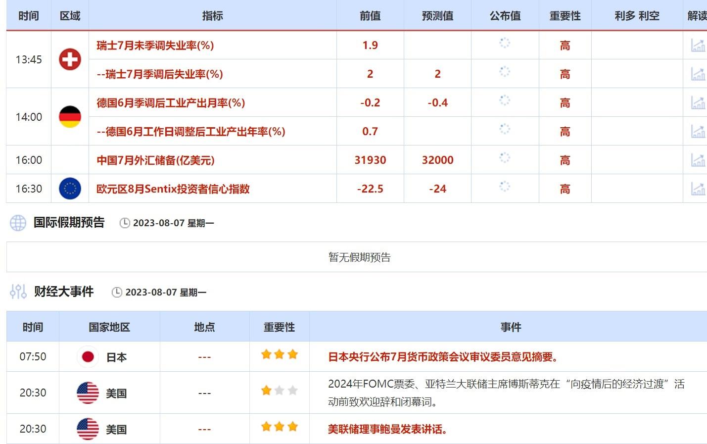 ①8月7日(周一)关键字:欧元区8月Sentix投资者信心指数,美联储理事鲍曼