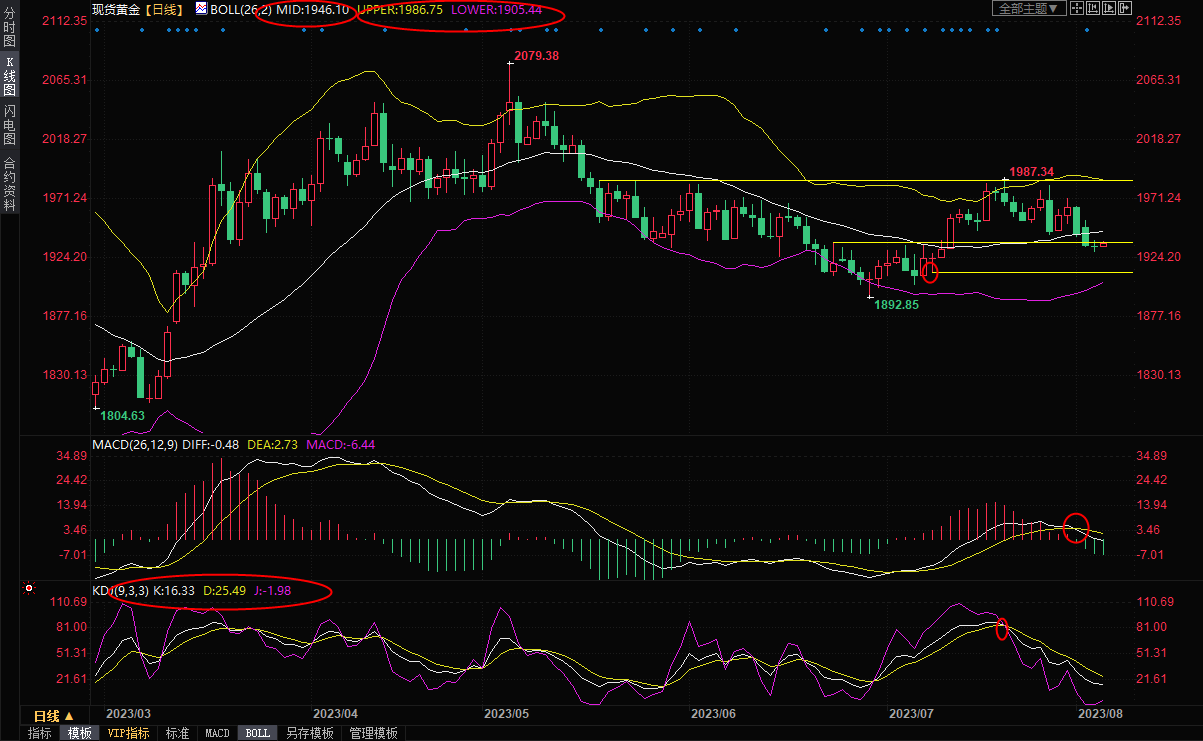 另外需要提醒是,本周出炉的美国7月份ISM制造业和非制造业PMI数据的就业分项指数均弱于前值,制造业就业分项指数由48.1下降至44.4,非制造业就业分项指数由53.1下降至50.7,这暗示美国7月份就业市场可能表现不佳。当然,仍有一些经济学家预计失业率会下降至3.5%。日线级别:震荡;MACD死叉,KDJ死叉,金价回落至除200日均线的所有均线下方,也失守布林线中轨,后市略微偏向空头,可能会进一步试探布林线下轨1905.43附近支撑,甚至是200日均线1893.14附近,6月29日触及的近五个月低点支撑也在该位置附近。短线的话,1920关口和7月10日低点1912.57附近支撑,也需要予以留意。