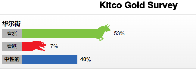 上周15位华尔街分析师参加了Kitco News黄金调查。其中有8位分析师(53%)预计未来一周金价会走高,6位分析师(40%)对金价持中性看法。只有1位分析师预计未来七天金价会下跌,占比7%。