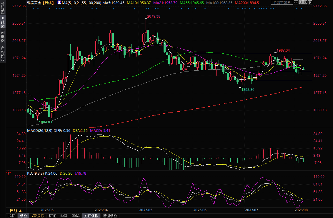 整体来看,由于非农的欠佳表现,美元和美债收益率下跌,金价的短线下行风险有所减弱,上周五金价探底回升后,短线多头机会也有所增加;但在本周美国7月份CPI数据出炉前,市场可能还会有一些观望情绪,考虑到上方仍有布林线中轨和多根均线的压制、美联储理事的鹰派讲话,仍需提防金价继续震荡下行的可能性。上方重点留意21日均线1953.79和100日均线1968.35附近阻力,下方留意1930关口附近支撑。北京时间10:15,