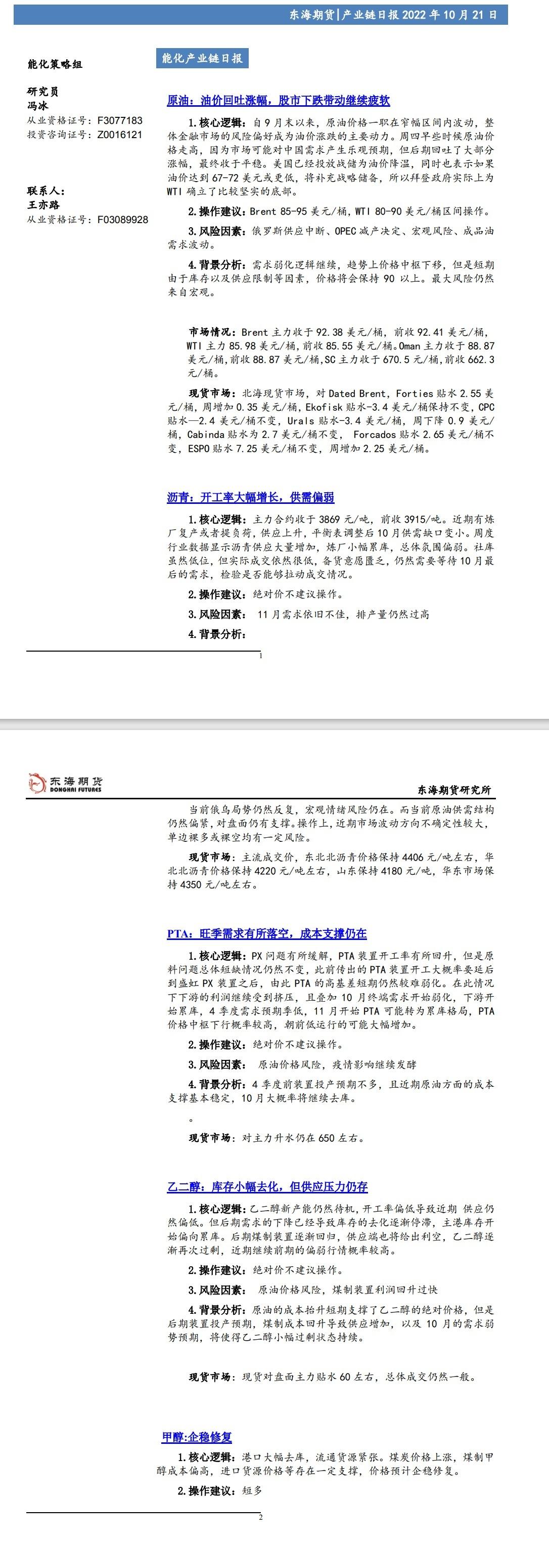 标题:【东海期货10月21日产业链日报】能化篇:油价回吐涨幅,股市下跌带动继续疲软