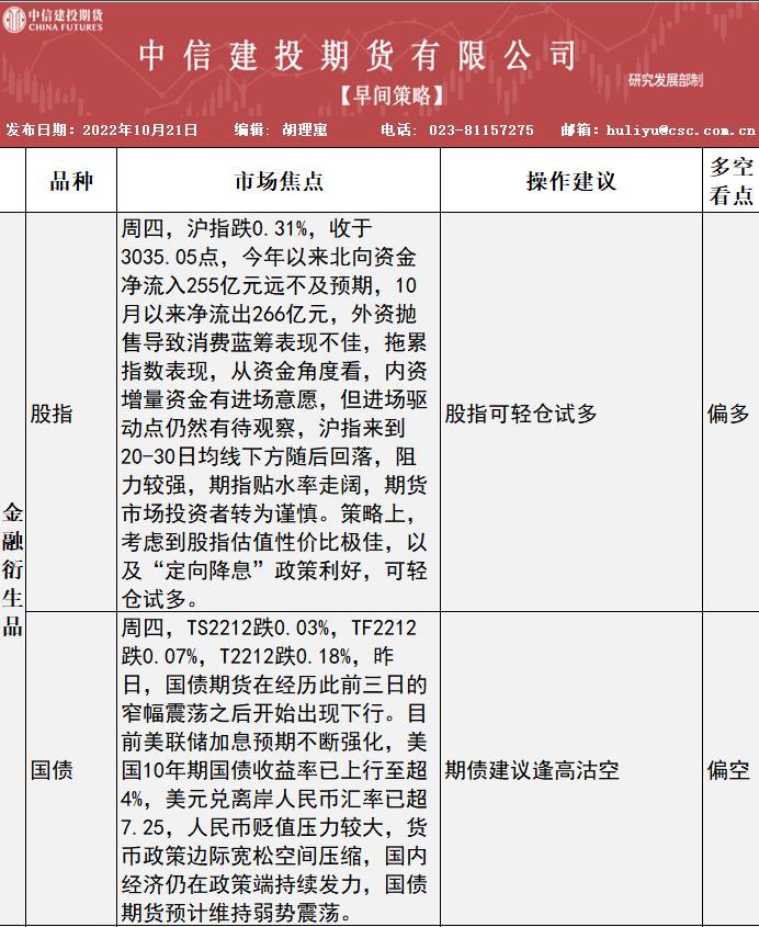 10月21日,中信建投期货发布早间策略,认为黄金白银预计短期震荡运行,原油观望,豆粕空单继续持有,苹果可考虑轻仓试多,生猪01合约基差有望保持较高水平,远月波动空间有限。