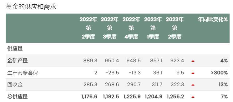 所有黄金供应板块都取得增长,推动二季度黄金总供应同比增长7%,达到1,255吨。上半年金矿产量估计达到了创纪录的1,781吨。