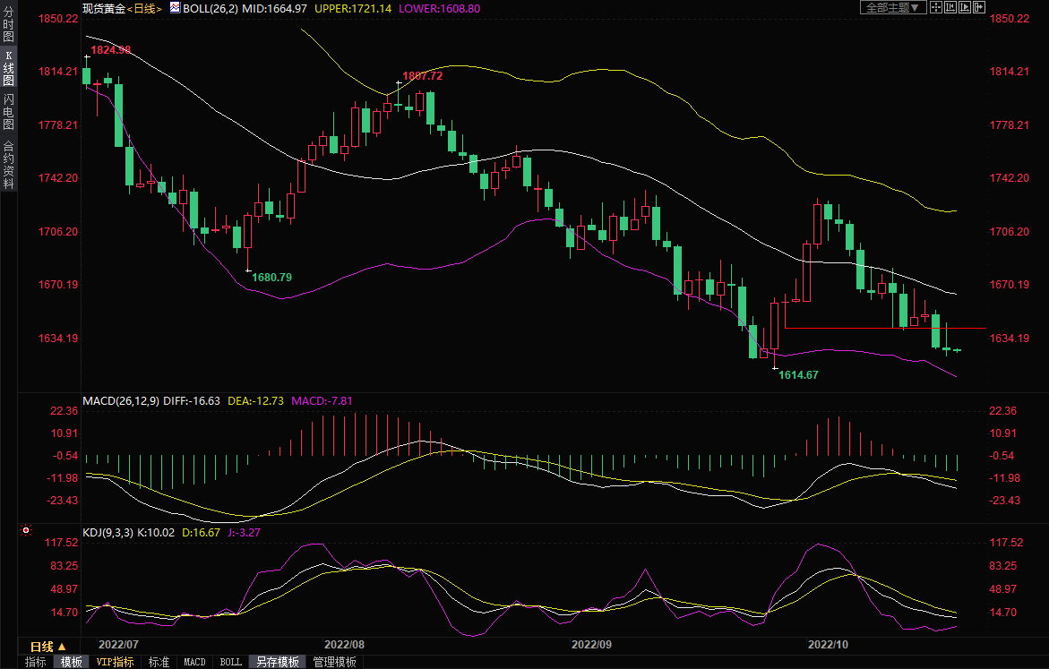 整体来看,虽然地缘局势紧张,英国政局混乱,一度吸引逢低买盘支撑金价,但美联储年内再进行两次加息75个基点的预期进一步攀升,美债收益率也不断刷新多年高点,美元相对强势,对金价形成了较为明显的压制,周四的反弹受阻进一步打击多头士气,技术面看空信号持续,金价短线仍偏向震荡下行,可能会试探布林线下轨1608.80附近支撑。北京时间09:43,