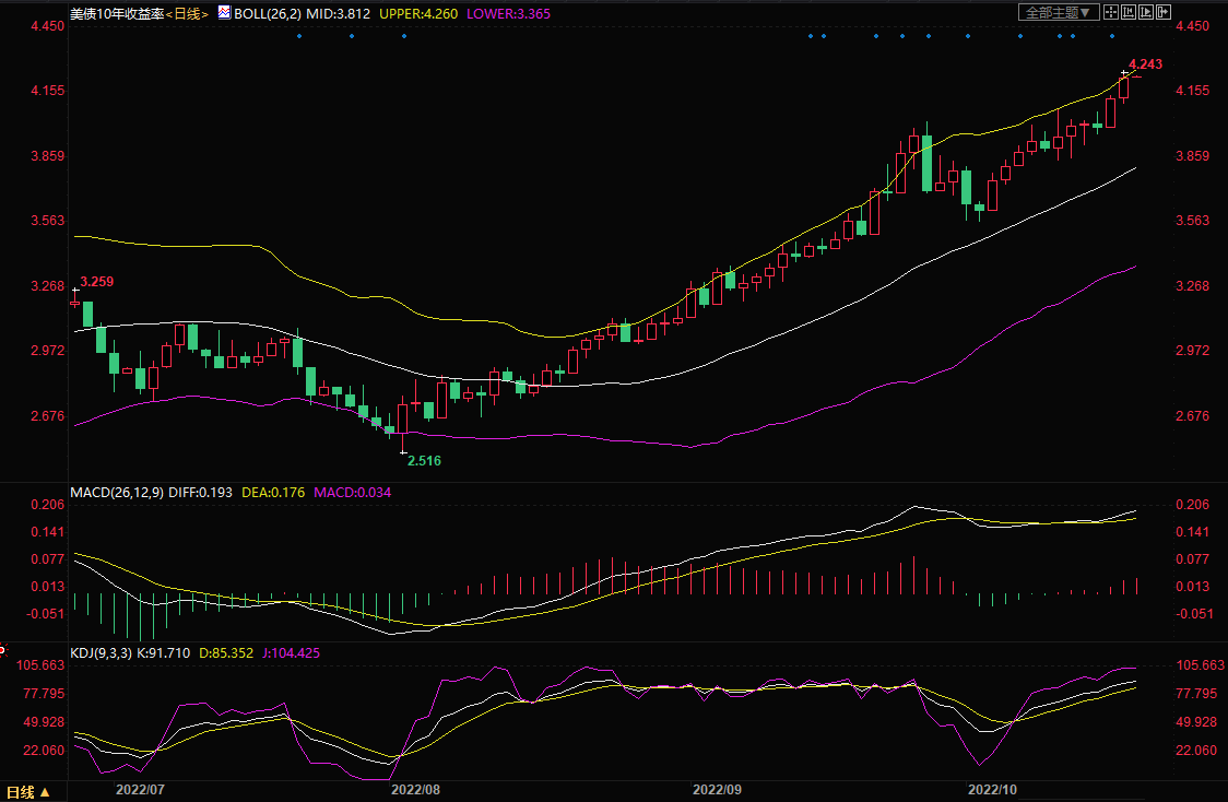 美国10年期国债收益率最高升至约4.24%,为2008年6月以来的最高水平。尾盘上涨近10个基点,报4.2283%。