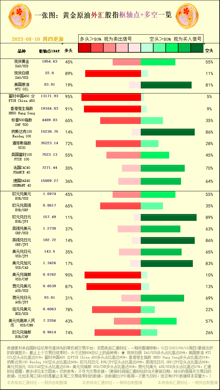标题:一张图:2023/08/10黄金原油外汇股指"枢纽点+多空占比"一览