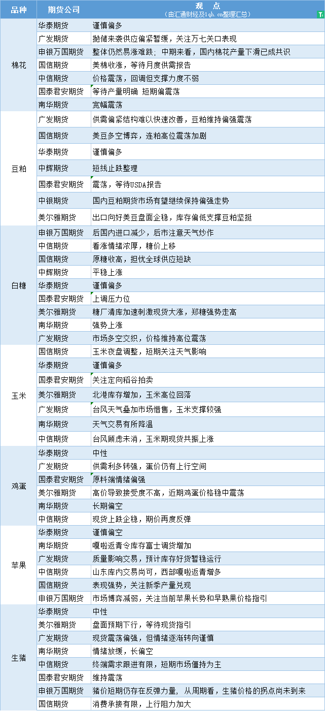 标题:期货公司观点汇总一张图:8月10日农产品(棉花、豆粕、白糖、玉米、鸡蛋、生猪等)