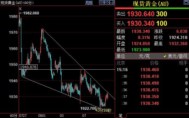 现货黄金下跌0.01%至1924.92美元/盎司;COMEX期金主力合约下跌0.06%至1958.8美元/盎司;