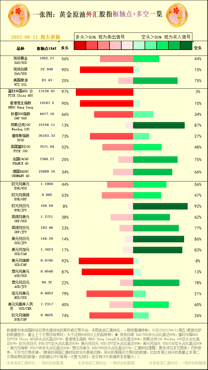 标题:一张图:2023/08/11黄金原油外汇股指"枢纽点+多空占比"一览