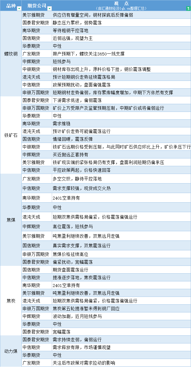 标题:期货公司观点汇总一张图:8月11日黑色系(螺纹钢、焦煤、焦炭、铁矿石、动力煤等)