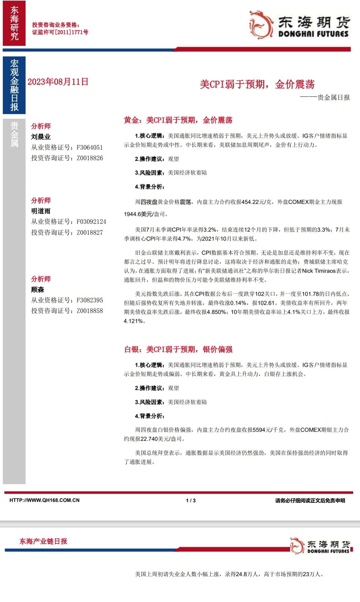 标题:【东海期货8月11日产业链日报】贵金属篇:美CPI弱于预期,金价震荡