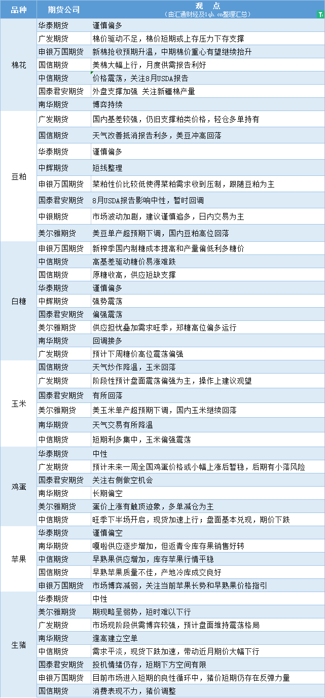 标题:期货公司观点汇总一张图:8月14日农产品(棉花、豆粕、白糖、玉米、鸡蛋、生猪等)