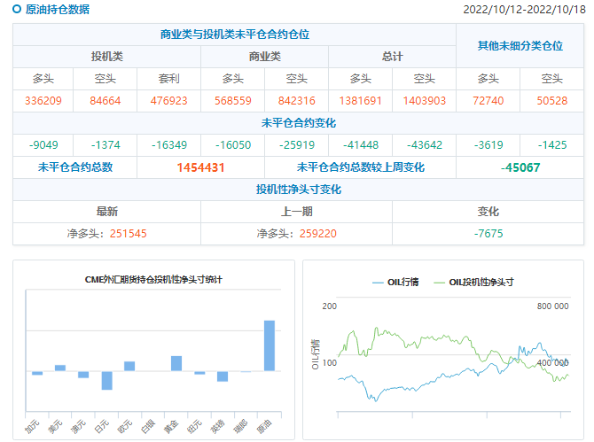 能源类持仓:截至10月18日当周,投机者所持布伦特和WTI原油净多头头寸减少52262手至356726手合约。其中WTI原油净多头头寸下降32616手至176050手合约。NYMEX天然气净多头头寸降至31843手合约,创最近逾两年新低。