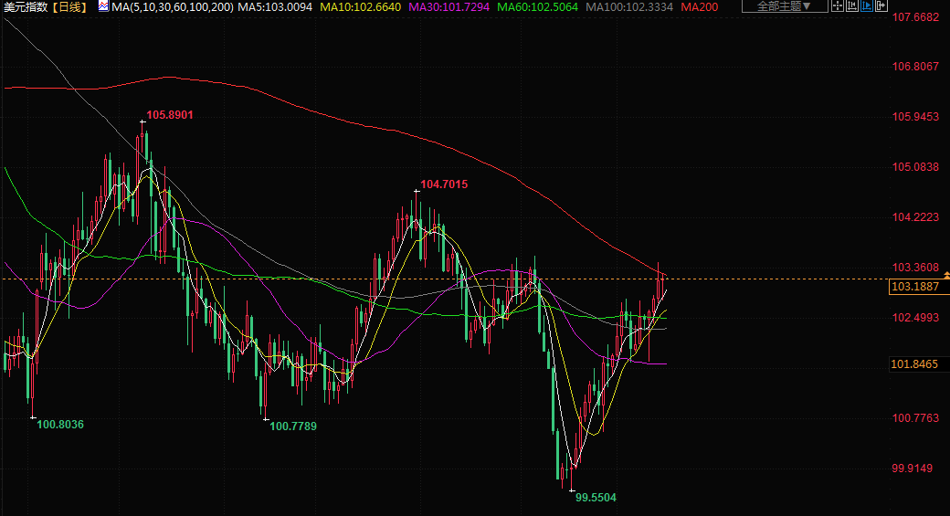 美元指数盘中低见102.800,尾盘上涨0.058%,报103.200,周一曾触及一个半月高点103.46。