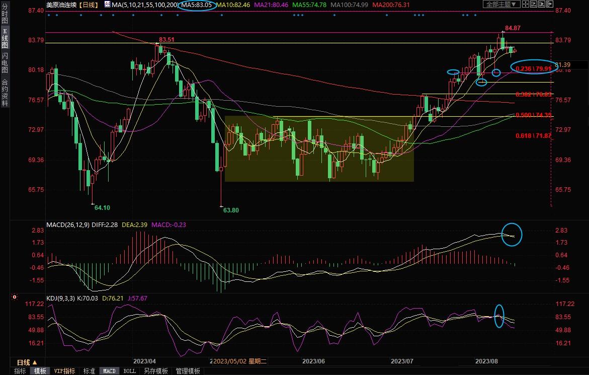 上方5日均线阻力目前在83.06附近,上周五低点阻力在83.78附近,若能收复该位置,则削弱短线看空信号,但仍需提防“M”顶的可能性。