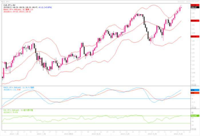 美元兑日元一举冲高至146.40这个近11各月一来未见过的高位,尾盘也基本收盘于高位146.38,全日录得0.53%的涨幅。截至当下,面对日元的持续走贬,日本央行尚未有任何表示和干预行动出现,这反过来将刺激投资者更大胆地进一步测试日本央行可容忍的底线水平在哪。日线图上,美元/日元继续沿着短期均线上方攀升,技术指标良好配合性上扬,显示美元多头追逐力量强劲。上方前进的目标继续瞄向148-150区域。但是还是要继续提醒留意日本央行随时现身干预的风险。