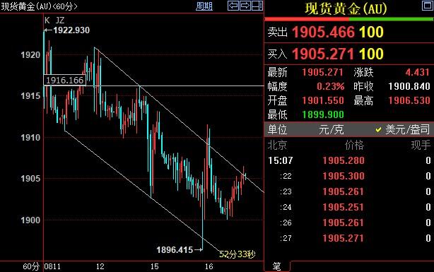 现货黄金自上个交易日录得的6月29日以来新低1896.26美元反弹,因