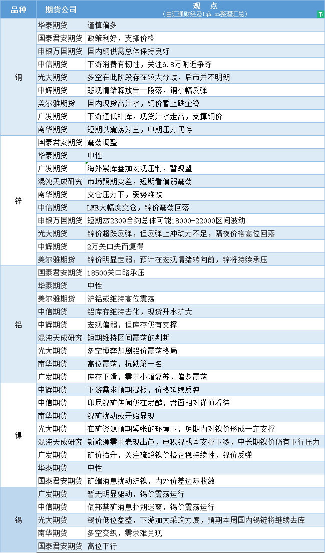 标题:期货公司观点汇总一张图:8月18日有色系(铜、锌、铝、镍、锡等)