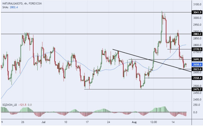 从技术上讲,天然气期货价格兑美元交易价格位于自去年7月24日以来延伸的动态支撑线2.62美元附近,且低于移动平均线。