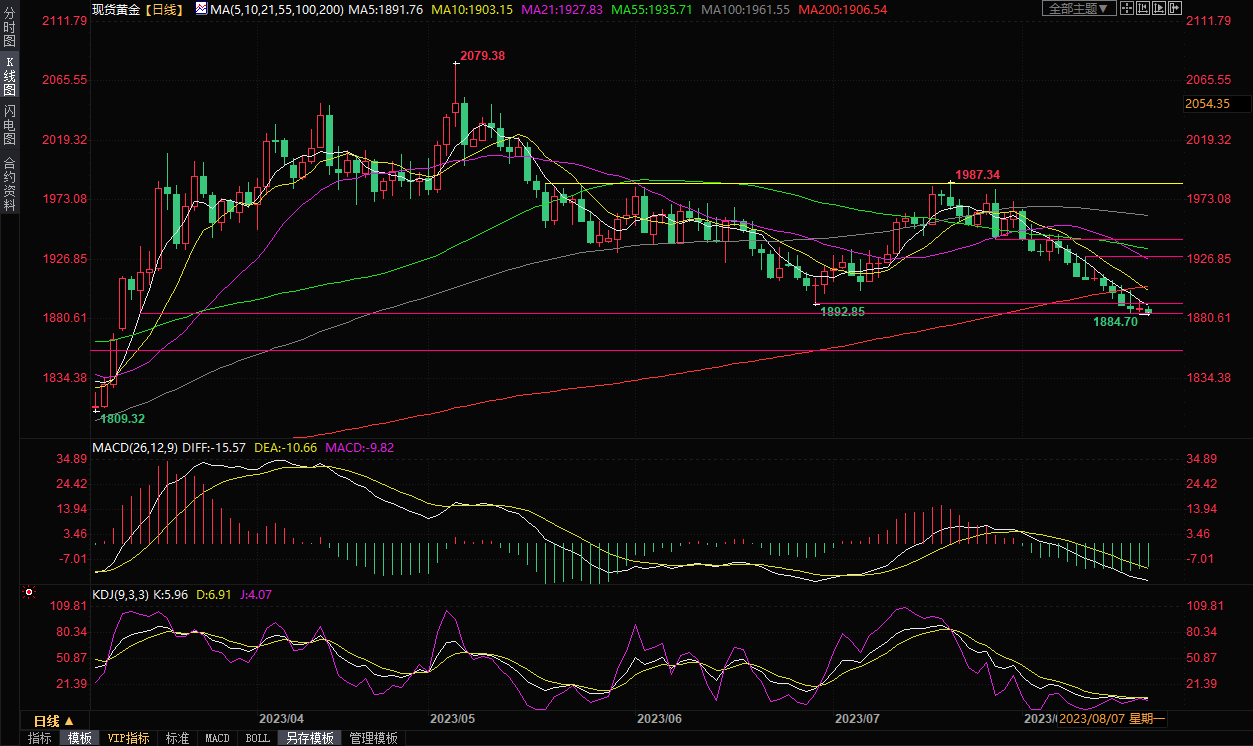 北京时间本周五22:05美联储主席鲍威尔将在杰克逊霍尔年会上发表讲话。调查显示,多数分析师倾向于看空黄金后市,散户对黄金后市走势则分歧较大。从技术面来看,多个信号仍偏向空头,在收复200日均线1906.54前,金价后市仍偏向进一步震荡下行,短线支撑参考1880关口附近位置,中线支撑参考3月6日低点1858.13附近位置。