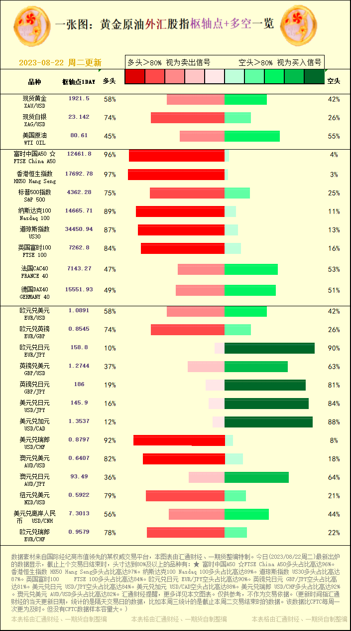 标题:一张图:2023/08/22黄金原油外汇股指"枢纽点+多空占比"一览