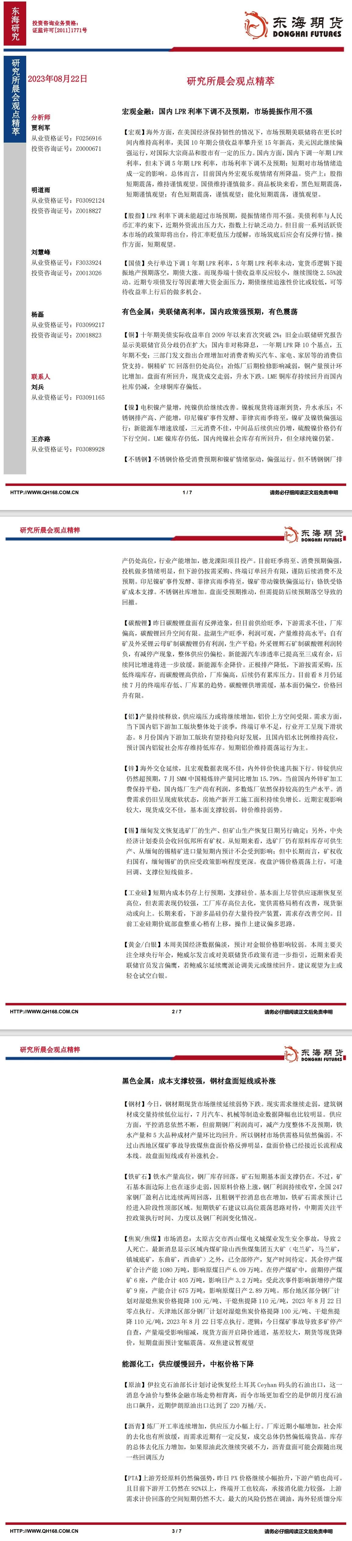 标题:【东海期货8月22日研究所晨会观点精萃】宏观金融:国内LPR利率下调不及预期,市场提振作用不强