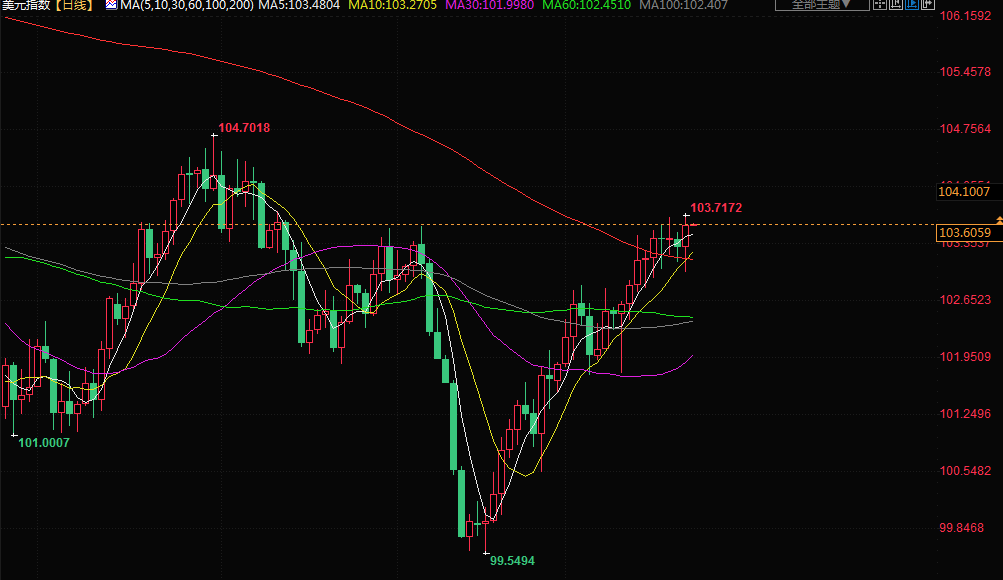 美元指数上涨0.2%,报103.57。目前该指数略低于上周触及的两个月高位103.68,当时对美国利率将保持高位的押注推动美元攀升。