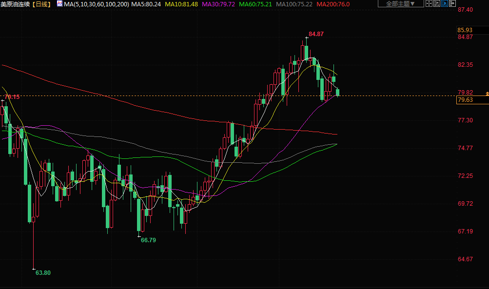 布伦特原油期货收跌0.5%,报每桶84.03美元;交投更为活跃的美国原油10月合约下跌0.48美元,报每桶79.64美元。美国原油近月合约下跌0.37美元,收报每桶80.35美元,在即将到期之前成交量非常有限。